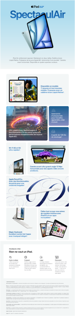 Entièrement repensé, l’iPad Air est boosté par la puce Apple M2 aux performances exceptionnelles. Il est doté d’un superbe écran Liquid Retina, d’une nouvelle caméra horizontale idéale pour FaceTime et les appels vidéo et de la connectivité ultra-rapide Wi Fi 6E.
