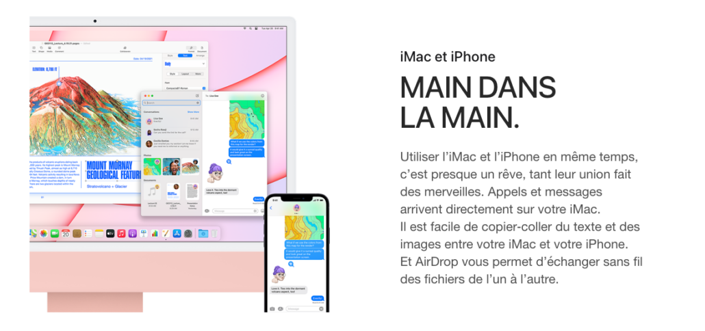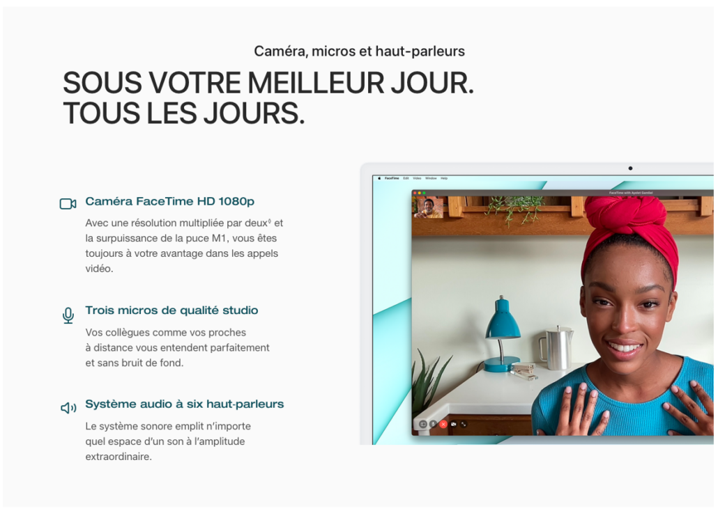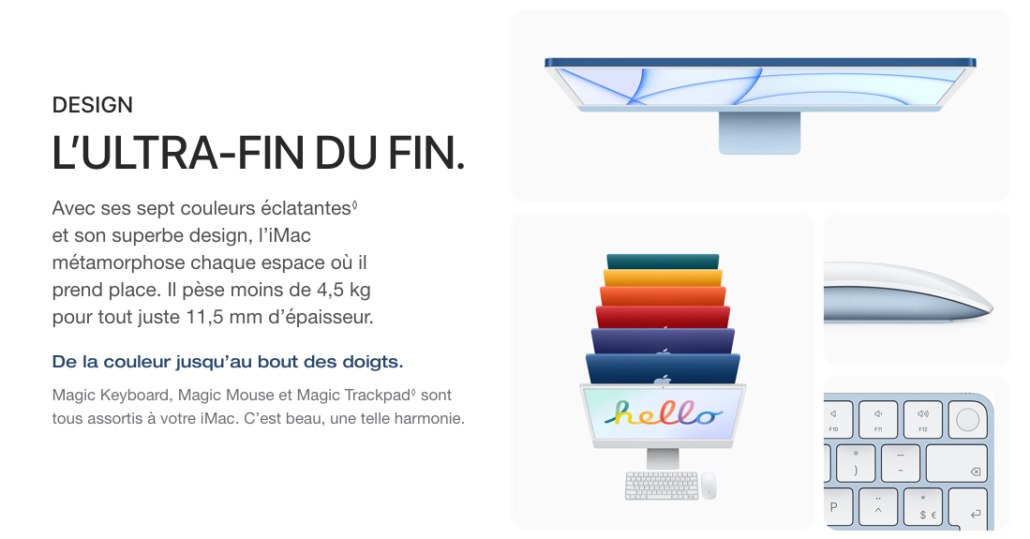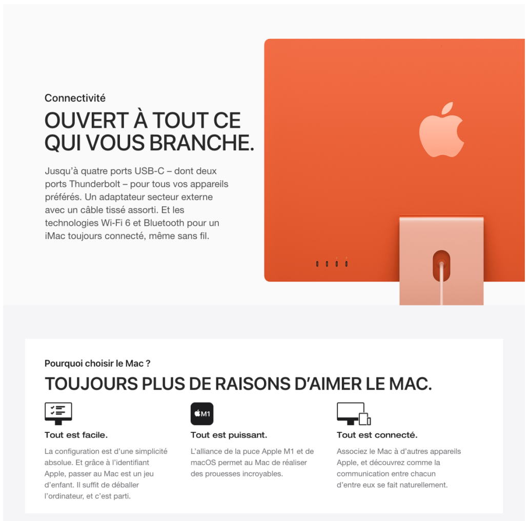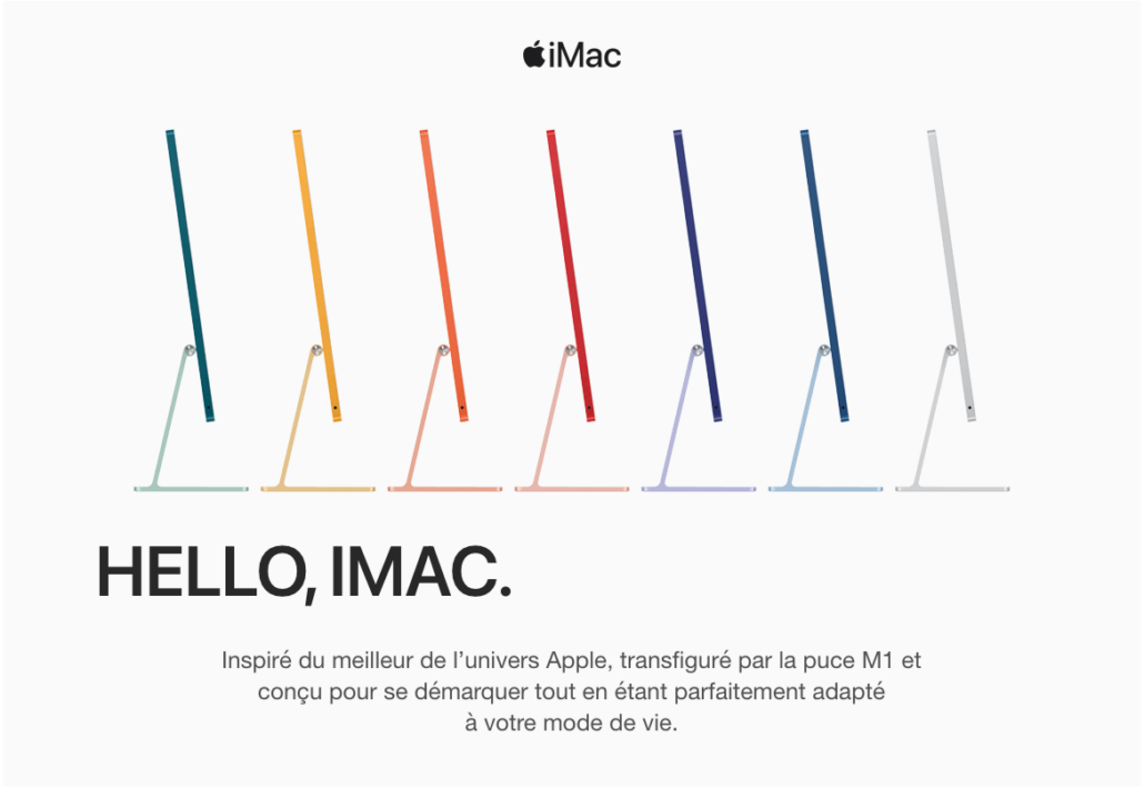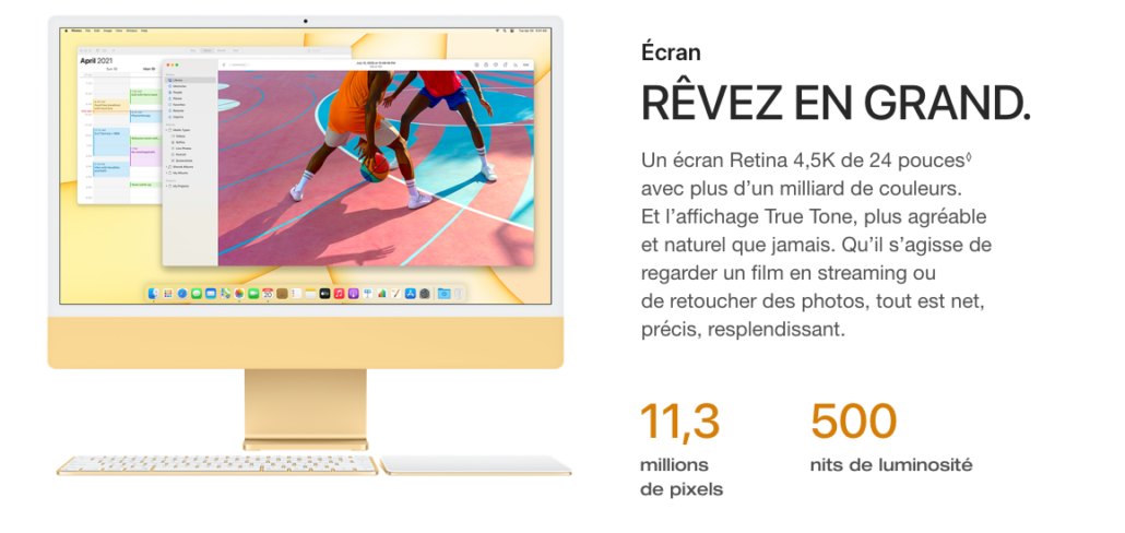 Transfiguré par la puce Apple M1, l’iMac 24 pouces est prodigieusement fin et cumule les talents. Il a été imaginé pour se démarquer où qu’il soit, tout en s’intégrant parfaitement à votre mode de vie.