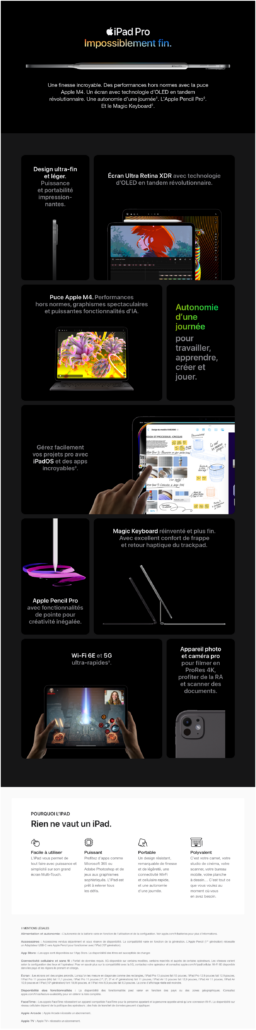 Le nouvel iPad Pro allie une incroyable finesse aux performances hors normes de la puce Apple M4. Il est doté d’un écran Ultra Retina XDR de pointe et de la connectivité ultra-rapide Wi Fi 6E.