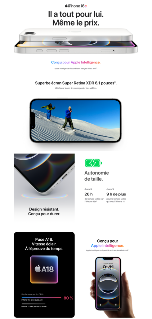 Conçu pour Apple Intelligence et boosté par la puce A18, l’iPhone 16e est doté d’une caméra Fusion de 48 Mpx qui vous permet de prendre des photos en super haute résolution. Et son autonomie de taille vous donne plus de temps pour échanger des messages et faire ce qu’il vous plaît.