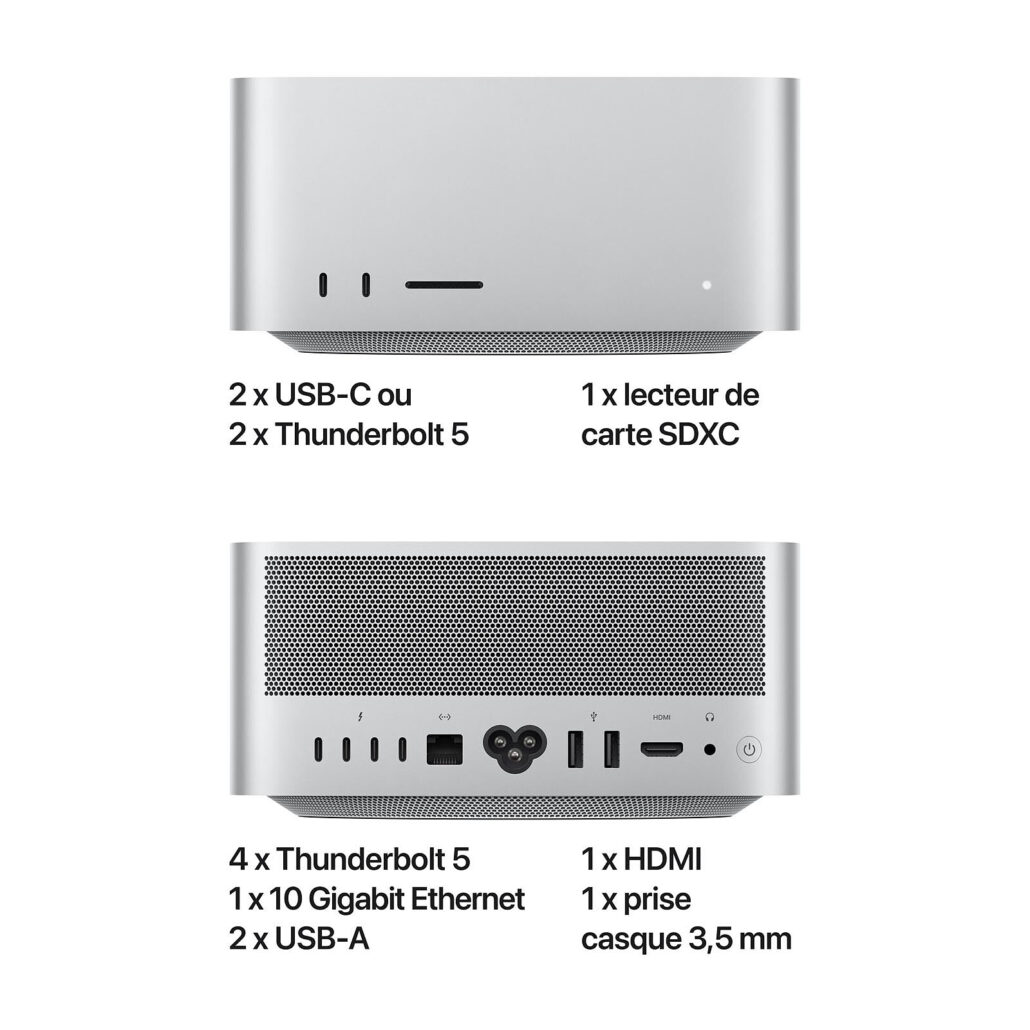 - TRÈS BRANCHÉ PERFORMANCES – Le Mac Studio intègre jusqu’à six ports Thunderbolt 5, et deux ports USB-A, un port HDMI, un lecteur de carte SDXC et une prise casque. Connectez jusqu’à cinq écrans externes avec la M4 Max, et jusqu’à huit avec la M3 Ultra.