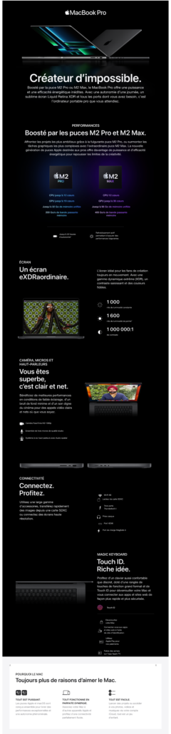 Le MacBook Pro doté de la puissante puce M2 Pro – ou de la M2 Max encore plus puissante – donne un sérieux coup de pouce à vos multiples activités, tout en vous offrant une autonomie d’une journée.