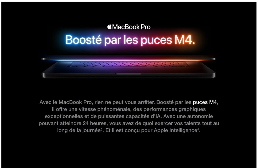 Type de processeur | Apple M4 (10-Core/GPU10-Core), Apple M4 Max (14-Core/GPU32-Core), Apple M4 Max (16-Core/GPU40-Core), Apple M4 Pro (12-Core/GPU16-Core), Apple M4 Pro (14-Core/GPU20-Core) |