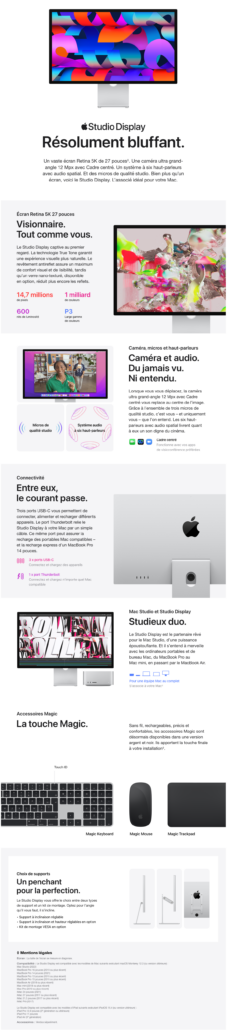 Nouveau Studio Display. Un écran Retina 5K de 27 pouces immersif, une caméra ultra grand-angle 12 mégapixels avec cadre centré, des micros de qualité studio et six haut-parleurs avec audio spatial. Le Studio Display s’entend à merveille avec n’importe quel Mac.