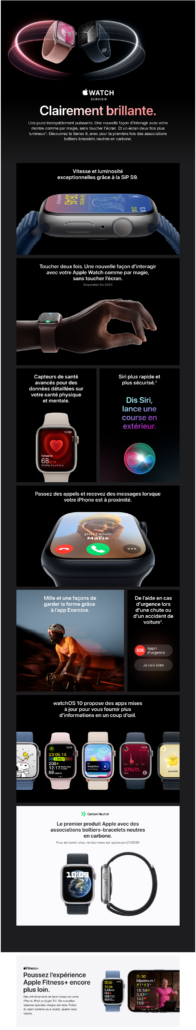 L’Apple Watch Series 9 vous aide à rester en contact, en forme, en bonne santé et en sécurité. Elle offre le geste toucher deux fois pour interagir avec l’Apple Watch comme par magie, un écran encore plus lumineux, Siri sur l’appareil plus rapide et Localisation précise pour iPhone.